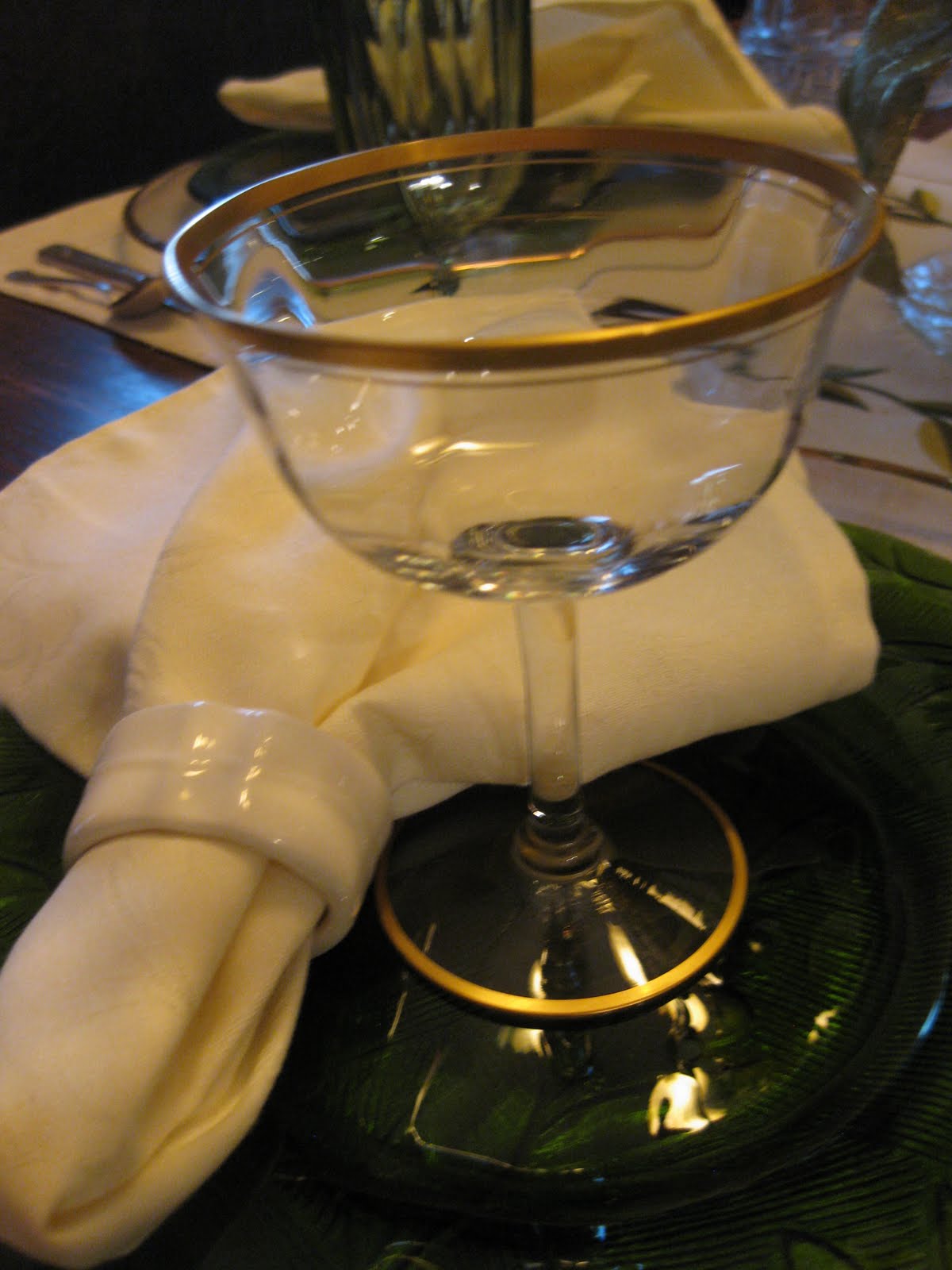 It wasn't these gold rimmed champagne glasses -- these were antiques when they were given to us as a wedding gift almost 35 years ago. I kept saving them for some special celebration -- but my husband doesn't like champagne. Now I've decided that they're perfect for shrimp cocktails, or perhaps a fruit salad, or even dessert. And not the cream damask napkins or napkin rings either.
