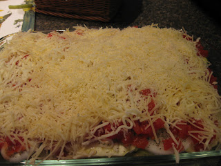 First I layered a can of diced tomatoes and over that I sliced all the squash and a white onion.